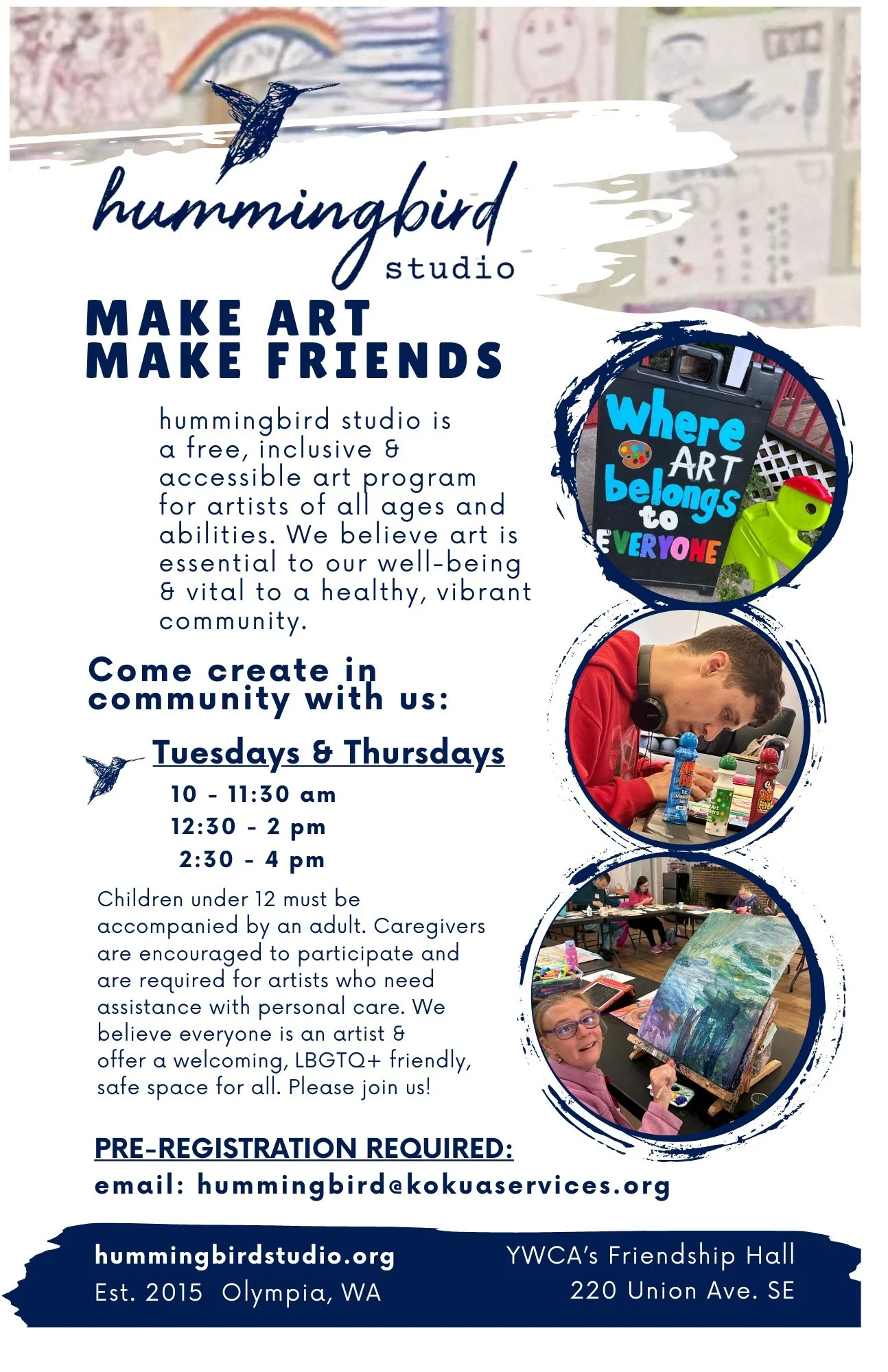 hummingbird studio is offered at no cost to the community with the intention of making art accessible to everyone. We believe that art empowers, unites, and contributes to everyone’s quality of life. We create community when we create in community. Please donate today to help us continue to provide a free, accessible, safe & inclusive creative studio experience in beautiful downtown Olympia, WA.